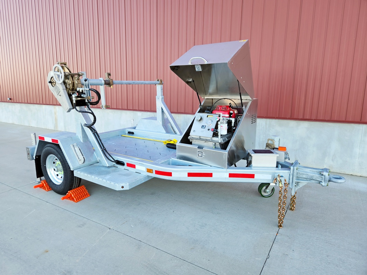 This Single-Reel Tensioning Trailer for line construction is great for distribution tensioning plus available options for improved usefulness. The standard All Bronze Tensioning Brake is the standard for distribution tensioning. The included SmartPerf cargo area has capacity to haul materials, including a pad mount transformer.