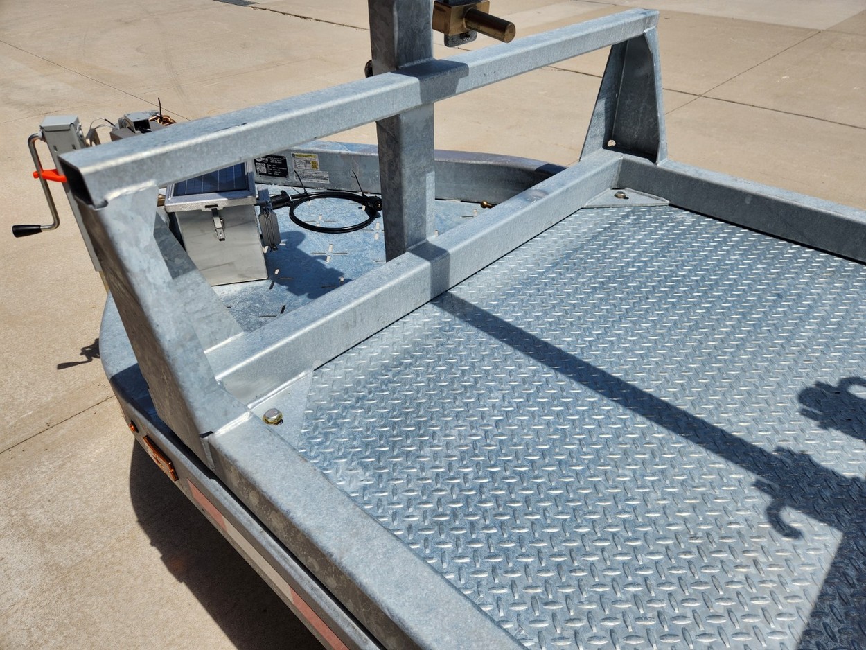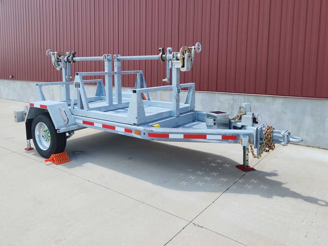 Dual reel capacity and a large cargo area offered by this two-reel stringing trailer will improve your crew's efficiency in line construction and maintenance. The standard Model 1602 All Bronze Brakes plus optional hydraulic retriever and power sources are perfect for overhead distribution line work. The cargo area includes LogiPerf Sides and lashing rings and you can specify other tiedowns or d-rings to keep your cargo secure. Of course, all the standard Sauber features are included such as bent tube construction, galvanized finish and hidden automotive wiring harness for the durability utility work demands.